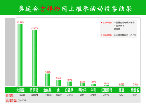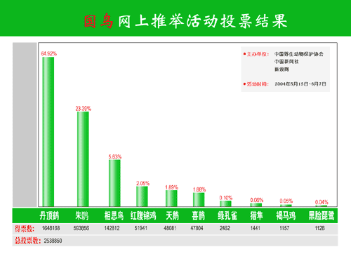 這項(xiàng)由中國(guó)野生動(dòng)物保護(hù)協(xié)會(huì)、中國(guó)新聞社、新浪網(wǎng)聯(lián)合全國(guó)二十多家新聞網(wǎng)站舉辦的活動(dòng),在規(guī)模、規(guī)格、權(quán)威與影響上創(chuàng)造了此類推舉活動(dòng)的全國(guó)之最。主辦單位今天介紹,在嚴(yán)格身份認(rèn)證的情況下,二十多天的推舉活動(dòng)期間,全國(guó)三十個(gè)省市自治區(qū)以及東南亞華僑、華人在內(nèi)的五百萬網(wǎng)民參與了投票。引人注目的中國(guó)傳統(tǒng)文化鳥丹頂鶴集中了網(wǎng)民近六成的投票,即便是在吉祥物推舉中,也僅以微弱差距屈居第二。