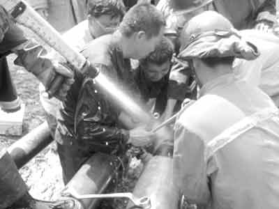 據(jù)朝陽市消防局副局長姚安介紹:“我們共出動70余名官兵、10臺消防車。由于汽油管道發(fā)生炸裂,引起了另一條柴油輸送管道的法蘭盤(管道的接頭)向外泄漏柴油,現(xiàn)在這7條輸油管道每條里都有5噸油,一旦引爆后果不堪設(shè)想。我們用兩臺泡沫滅火車和若干水槍給管道降溫,同時用來稀釋泄漏的柴油,并更換法蘭盤。”