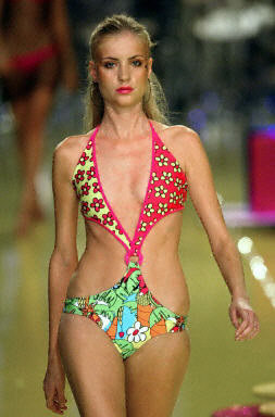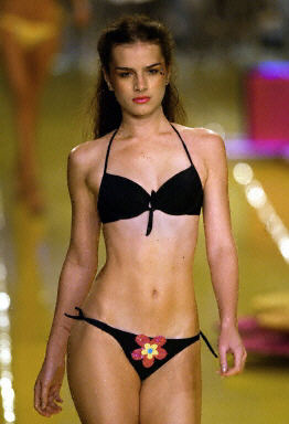 6月22日,在巴西圣保羅時(shí)裝周上,模特們展示了設(shè)計(jì)師Poko Pano設(shè)計(jì)的性感比基尼。