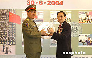 中新網(wǎng)6月30日電 香港郵政今日發(fā)行“中國人民解放軍駐香港部隊”特別郵票。發(fā)行儀式今早在香港郵政總局舉行,香港郵政署長蔣任宏與中國人民解放軍駐香港部隊參謀長王玉仁少將一同在巨型首日封上蓋印,象征郵票正式發(fā)行。