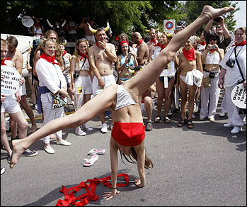 中新網(wǎng)7月7日電 西班牙的一群人穿著內(nèi)衣反對(duì)傳統(tǒng)的斗牛和奔;顒(dòng),圖為人們正看著一名女子在抗議活動(dòng)中表演倒立。但恐怕他們的反對(duì)很難有結(jié)果,斗牛和奔牛是傳統(tǒng)節(jié)日“圣·佛明節(jié)”中最主要的活動(dòng)項(xiàng)目,而“圣·佛明節(jié)”是西班牙三大地方節(jié)慶之一,為的是紀(jì)念西班牙潘普洛納市的守護(hù)神“圣·佛明”——西班牙每座城鎮(zhèn)幾乎都有一位守護(hù)神,每當(dāng)?shù)搅耸刈o(hù)神生日的這一天,當(dāng)?shù)鼐用窬蜁?huì)組織一場(chǎng)慶典,大部分慶典中都有斗牛和奔牛項(xiàng)目。(固山)