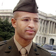 亨德森現(xiàn)年29歲,是駐美加州長(zhǎng)灘第3海航炮火聯(lián)絡(luò)連的一名后備役軍人,他于去年參加了美國(guó)對(duì)伊拉克的戰(zhàn)爭(zhēng)。在影片中,他與導(dǎo)演摩爾在美國(guó)國(guó)會(huì)大廈外有這樣一段對(duì)話: