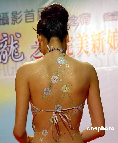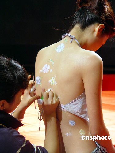 2004年8月7日,南京市某商家在其新產(chǎn)品推介會上,再次請來模特現(xiàn)場彩繪秀,以吸引消費(fèi)者眼球。作者:王耀武