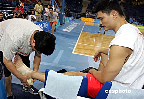 “姚明來了!”一聲聲欣喜的驚呼后,各路老記從不同的方向奔向已在休息長椅上坐下的姚明。姚明在隊醫(yī)的協(xié)助下往腳上裹纏紗布的畫面被無數(shù)的照相機和攝影機攝入鏡頭。