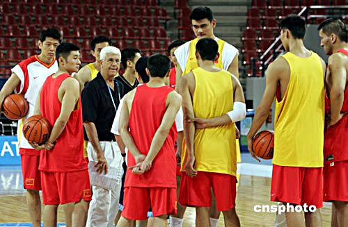 當滿頭銀發(fā)的中國男籃主帥哈里斯姍姍出現(xiàn)在訓練館內(nèi)時,隊員們開始集合,此時比預定的訓練時間晚了半個多小時。在例行的熱身活動后,中國男籃分成黃、紅兩隊進行了幾套戰(zhàn)術(shù)的演練。由姚明、易建聯(lián)、李楠、劉煒、朱芳雨等組成的黃隊無疑是中國男籃的主力陣容。