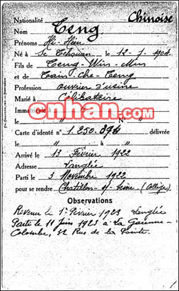 卡片的主要內容為———國籍:中國;姓名:鄧希賢;出生:四川,1904年7月12日(中國農歷———編者注);父親:鄧文明;職業(yè):工廠工人;婚姻狀況:未婚;身份卡號碼:1·250·349;到達日期:1922年2月13日;居住地點:leangle;離開時間:1922年11月3日;目的地:賽納-夏狄戎中學;備注:1923年2月1日重返leangle;1923年6月11日離去,前往拉加雷納-科隆市的德拉普安特街39號。