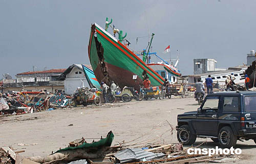 印度尼西亞海嘯災(zāi)難已歷經(jīng)十五日,1月9日,在班達(dá)亞齊伯納永區(qū)災(zāi)區(qū)最「壯觀」的景象應(yīng)屬船只被沖上岸。據(jù)當(dāng)?shù)厝私榻B,海岸離市區(qū)約有四、五公里遠(yuǎn),即是說(shuō),這些船被沖出了四、五公里遠(yuǎn),可見(jiàn)海嘯的沖擊力。