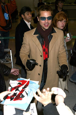 當(dāng)身穿駝色大衣,佩戴黑色圍巾和墨鏡的皮特出現(xiàn)在機場大廳時,持?jǐn)z像手機等候以久的影迷們頓時尖叫起來,而皮特也非常友好地和他們揮手致意,并且為部分影迷簽名留念。他在《十二羅漢》中的合作伙伴馬特戴蒙也將出席他們在日本的宣傳活動。
