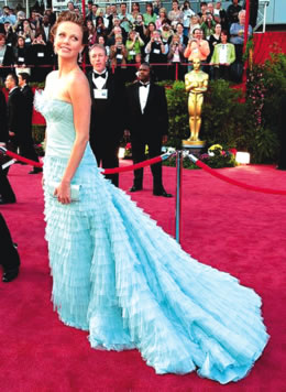 作為奧斯卡上屆影后的查理茲·塞隆,今年當(dāng)然不能在服裝上輸給“小輩”。一層層的細(xì)紗打成小褶羅列成寶塔形,讓人一望就是工藝不凡。層層疊疊的感覺(jué)外加淡淡的藍(lán)綠色調(diào),讓這位美女就像美人魚(yú)一般美麗動(dòng)人。