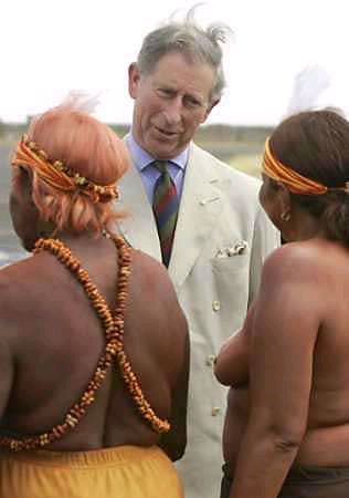 3月2日,查爾斯前往澳大利亞內(nèi)地進(jìn)行訪問。王儲(chǔ)一抵達(dá)愛利斯泉,就由赤裸著上身的土著婦女熱情迎接,王儲(chǔ)看得兩眼不知該往哪里瞧才好。土著人又給他端上一桌蟲蟲大餐,更讓王儲(chǔ)吃不消。