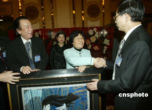 三月八日,國(guó)務(wù)院僑辦主任陳玉杰在北京世紀(jì)飯店會(huì)見(jiàn)列席全國(guó)政協(xié)十屆三次會(huì)議的海外華僑華人代表。作者:史利