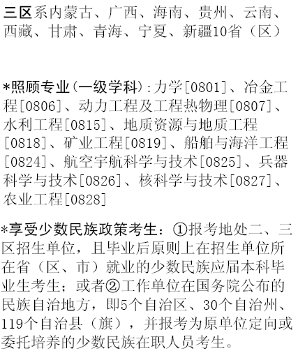 二、體現(xiàn)了統(tǒng)籌兼顧、協(xié)調(diào)發(fā)展的原則。根據(jù)我國東西部地區(qū)經(jīng)濟、教育發(fā)展不平衡的現(xiàn)實狀況,對報考西部地區(qū)和少數(shù)民族地區(qū)的考生以及少數(shù)民族考生采取適度照顧的政策。對礦業(yè)、地質(zhì)等11個艱苦專業(yè)繼續(xù)采取適當照顧政策。