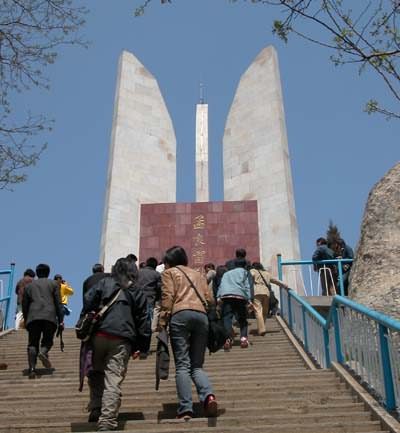 1984年為紀(jì)念孟良崮戰(zhàn)役在山上修建的紀(jì)念碑高30米,由三塊狀如刺刀的灰色花崗石筑成,象征著野戰(zhàn)軍、地方軍和民兵的武裝力量體制。底座為邊長20米、高1.6米的正三棱體,組成一個槍托,意喻槍桿子里面出政權(quán)。紀(jì)念碑的上下部構(gòu)成一個有機(jī)的整體,象征著軍民團(tuán)結(jié)必勝,人民戰(zhàn)爭必勝。