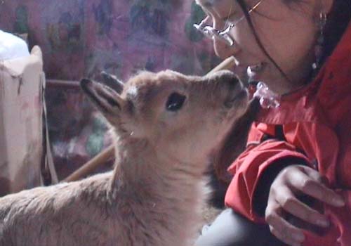 可愛的藏羚羊小羊羔與人的親切相吻(圖)