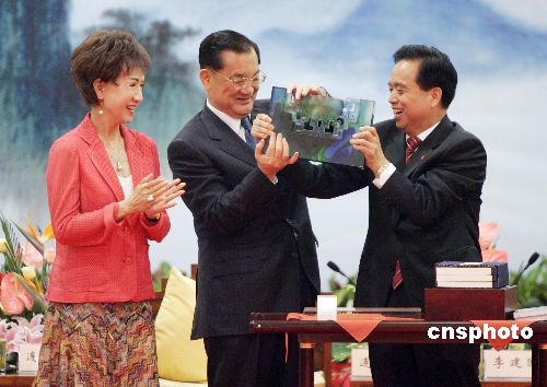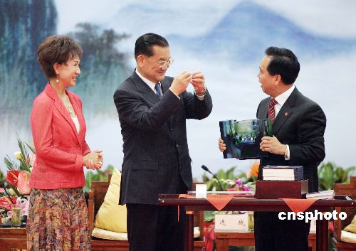 中共陜西省委書記李建國四月三十日晚在西安會(huì)見并宴請(qǐng)中國國民黨主席連戰(zhàn)和他率領(lǐng)的大陸訪問團(tuán)成員。圖為連戰(zhàn)向李建國回贈(zèng)禮物。作者:毛建軍