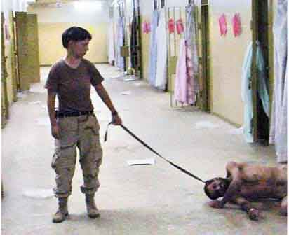阿布格里卜監(jiān)獄虐囚丑聞曝光后,英格蘭出現(xiàn)在幾張最為令人震驚的照片上,成為這起丑聞的代表性人物。在一張照片上,口叼香煙的英格蘭笑著用手指向赤身裸體的男囚下體;在另一張照片上,英格蘭站在一群被迫疊羅漢的裸體男囚身后,翹起拇指稱快;還有一張照片顯示她用牽狗的皮帶牽著一名赤身躺在地上的男性囚犯。