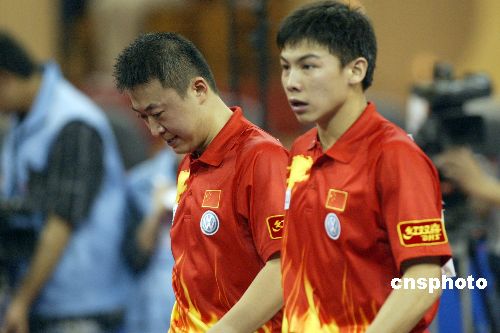 五月四日,在上海體育館進(jìn)行的第四十八屆世界乒乓球錦標(biāo)賽男雙半決賽中,雅典奧運(yùn)會(huì)冠軍馬琳、陳玘以一比四不敵德國新搭檔蘇斯、波爾,無緣決賽。這也使中國選手提前獲得男雙冠軍的希望落空。圖為馬琳(左)、陳玘黯然離開賽場(chǎng)。 作者:盛佳鵬