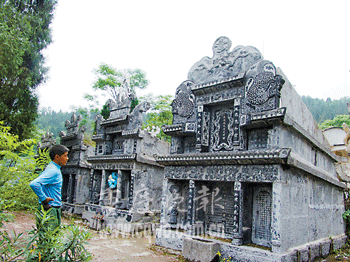 田緒明說,在彭水替人修建活墓已經(jīng)形成一項(xiàng)產(chǎn)業(yè)。彭水縣漢葭鎮(zhèn)至少有三撥兒石工,專門替人做生基。但是這些石工都只能包到二道工,因?yàn)橛幸恍⿲iT的包工頭,每天夾個(gè)皮包,四處亂竄動(dòng)員那些發(fā)財(cái)?shù)纳馊、官員等修建活墓,承包到工程后立即轉(zhuǎn)手。頭道包工頭能從每個(gè)活墓轉(zhuǎn)包中凈獲利潤為工錢總額15-20%。但是如今管理已經(jīng)越來越嚴(yán)格,愿意修建活墓的官員大都是已經(jīng)退休的干部,現(xiàn)職干部幾乎沒有。(來源:重慶晚報(bào);記者丁香樂文/圖)