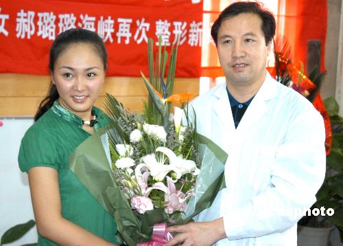 號稱“中國第一人造美女”的郝璐璐,五月十九日在福州某美容醫(yī)院將鮮花獻(xiàn)給即日將為她實(shí)施前臂、大小腿減脂術(shù)的該院主治醫(yī)生。作者:劉可耕