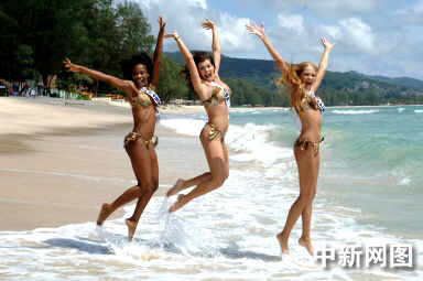 5月19日,2005環(huán)球小姐參賽佳麗在泰國普吉島泳裝亮相。