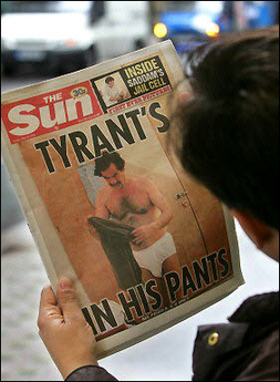 當(dāng)天《太陽報(bào)》刊登的這組照片題為“薩達(dá)姆的監(jiān)獄生活,先睹為快“。在頭版的一張照片中,薩達(dá)姆上身赤裸,只穿著白色內(nèi)褲,手里拿著衣服,身后是一扇沒有上漆的木門。