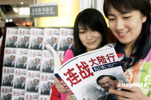 | 5月22日,由海峽兩岸出版交流中心研究部編輯,九州出版社出版的《連戰(zhàn)大陸行紀(jì)實》開始發(fā)售。據(jù)了解,此書以時間為經(jīng),以重大事件為緯,對連戰(zhàn)此次的大陸之行進(jìn)行了全面的梳理和提煉。該書在忠實、客觀的記錄本次事件的同時,也收錄了多方的反應(yīng),評論及相關(guān)的背景和花絮。作者:陳曉根