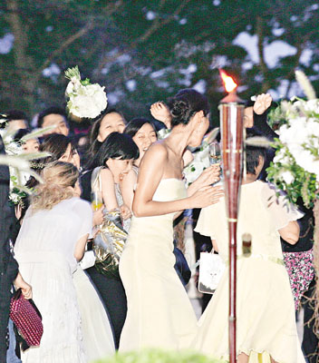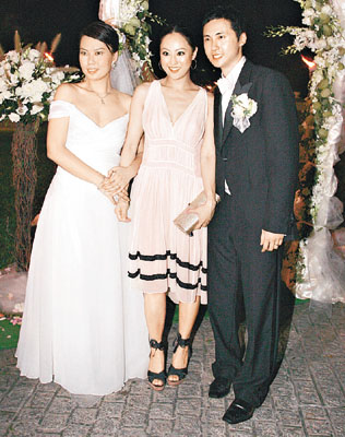新娘子Stephanie平日為旗下藝人做慣幕后軍師,前晚輪到她當(dāng)主角,她喜孜孜地說(shuō):“婚宴請(qǐng)了二百五十人,擺了二十五桌,Gigi送手鐲、莫文蔚送耳環(huán)、蔣怡送飾物、楊采妮送的好有心思,但我不會(huì)講是什么。最開(kāi)心天心都由臺(tái)灣來(lái)香港,楊采妮更陪我挑選結(jié)婚戒指,Gigi尋晚陪著我整晚,幫我想問(wèn)題考新郎。拋花球時(shí)我想另外一個(gè)圈外人接到,又想天心接到,因?yàn)樗杏岩积R來(lái)!