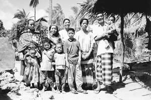 巴萊卡還熱情邀請(qǐng)記者參觀她的居室。她家共有兩座房子,這種房子不是磚墻瓦頂,而是珊瑚礁石筑成的墻壁和椰子樹葉組成的屋頂。室內(nèi)家具和用品十分簡(jiǎn)陋,當(dāng)?shù)貧夂蛞荒晁募据^熱,床上也都沒有被褥,鋪著椰子樹葉編織而成的粗糙席子,床角放著晚間蓋的幾塊大花布。廚房沒有灶臺(tái),就在地面上用小石塊支個(gè)小鐵鍋煮飯。