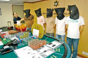 澳門治安警情報廳探員在酒店及關(guān)閘先后拘捕五名廣州男子,搗破運作超過兩個月的假賭場,搜出兩張可隨時組合的賭臺、面值超過三千一百萬元假籌碼,以及大批賭具,相信是澳門有史以來使用道具最多、規(guī)模最大的天仙騙局。警方相信尚有五至七人在逃,正全力追緝歸案。