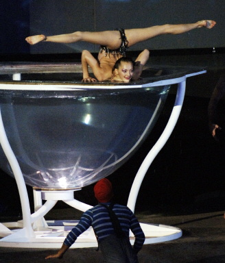 7月16日,2005世界游泳錦標(biāo)賽在加拿大蒙特利爾開幕。圖為開幕儀式上一名游泳者在圓柱形的容器上表演。