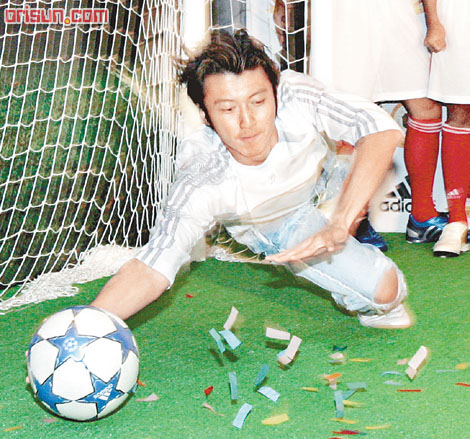 中新網(wǎng)7月19日電 據(jù)香港媒體報(bào)道,謝霆鋒昨日在灣仔出席某活動(dòng),同場(chǎng)還有將于本月底迎戰(zhàn)“紅魔”曼聯(lián)的港隊(duì)球員,雖然霆鋒手腳舊患仍未痊愈,但他仍到場(chǎng)做守門員,更不惜飛身?yè)踅馗坳?duì)球員的射球,背脊還撞向門柱,結(jié)果成功阻截港隊(duì)射球,表現(xiàn)相當(dāng)賣力。