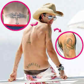 英國(guó)球星大衛(wèi)·貝克漢姆的家庭成員——6歲的布魯克林、2歲的羅密歐和5個(gè)月的克魯茲,以及妻子維多利亞——都在他身上留有永久的痕跡,不過他身上還有一些宗教色彩的文身,包括一個(gè)小天使和一個(gè)帶翅膀的十字架,據(jù)這些文身的作者說,“他把這些看做是保護(hù)孩子的守護(hù)神”。