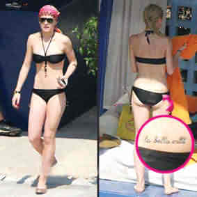 好萊塢新玉女琳賽·洛翰,在后腰部位文了一句意大利語“LaBellaVita”美麗人生,她的發(fā)言人說是為了紀(jì)念她2004年去世的祖父,在葬禮上,琳賽朗誦了一首詩,題目就叫《美麗人生》,半年后,她在新奧爾良拍攝電影《JustMyLuck》時(shí)文了這個(gè)文身。(據(jù)揚(yáng)子晚報(bào))