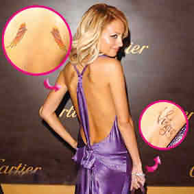 跟帕麗斯·希爾頓一塊出演真人秀《簡(jiǎn)單生活》的妮可·里奇,文身也崇尚簡(jiǎn)單,她的背上文了一對(duì)精巧的天使翅膀,右手腕上文了“Virgin”處女字樣,脖子上文了一個(gè)花環(huán)。