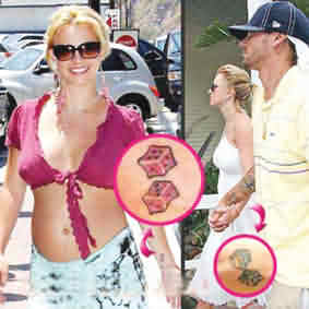 2004年5月,小甜甜布蘭妮和現(xiàn)在的老公凱文·費(fèi)德林同去愛爾蘭首都都柏林,兩人都在手腕上文了一對(duì)骰子圖案,一個(gè)紅色、一個(gè)藍(lán)色,這顯然是個(gè)幸運(yùn)的文身,一周后在返回美國(guó)的飛機(jī)上,他們訂婚了。