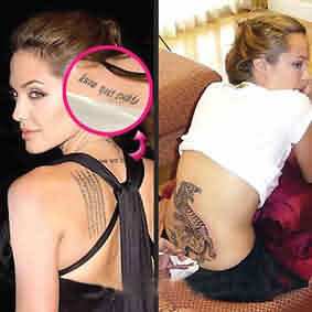 安吉麗娜·茱莉以喜愛文身知名,甚至不惜忍受肉體痛苦,2003年,一個(gè)曼谷僧人用一根15英寸的針在她的左肩刺下了五行避邪的經(jīng)文。2004年,他又用了兩個(gè)小時(shí)為安吉麗娜背部刺下一只猛虎,此外,她的頸部還文有“KnowYourRights”了解你的權(quán)利的句子。