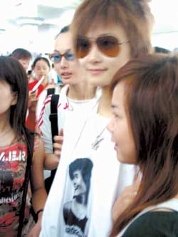 聽一位“玉米”說,他們昨天一直守在李宇春門口,她3點多才回住處,又要收拾東西,才睡了一個小時。昨天早上7點30分左右,李宇春出現(xiàn)在機場(其他超女坐下一班飛機),她確實是沒休息好的樣子,雖然一直在和歌迷微笑,卻掩蓋不住一臉疲憊。她穿了一件歌迷送的白色長袖外套,里面是一件印有自己頭像的白色T恤,據(jù)說這是北京的“玉米”們?yōu)樗喿龅,李宇春想讓北京歌迷高興一下。