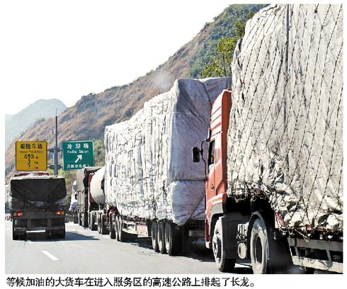 前天上午,巡邏民警從京港澳高速韶關(guān)段北上,只見乳源服務區(qū)入口、云巖服務區(qū)南行入口均有長達一公里左右的加油車龍。據(jù)了解,近日京珠北各服務區(qū)都出現(xiàn)大貨車排隊進服務區(qū)加油的現(xiàn)象,南下的大貨車在湖南境內(nèi)每次只能加到200元的柴油,在京珠北境內(nèi)服務一次加油最多也是400元,限量供應柴油造成了大貨車逢服務區(qū)必須進站加油。行駛的大型車缺油、車龍在路面排隊進服務區(qū)加油都給交通安全帶來壓力。