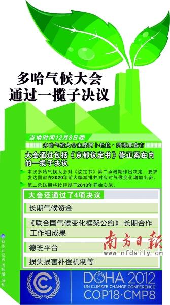 經(jīng)過(guò)一天一夜的“加時(shí)”鏖戰(zhàn),多哈氣候大會(huì)終于在當(dāng)?shù)貢r(shí)間8日晚上通過(guò)一攬子決議,戲劇般地落下帷幕。會(huì)議決定從2013年開(kāi)啟《京都議定書》第二承諾期,為期8年。此外,會(huì)議還決定到2015年時(shí)達(dá)成一個(gè)涉及所有國(guó)家的有關(guān)2020年后全球應(yīng)對(duì)氣候變化行動(dòng)的協(xié)議,并重申發(fā)達(dá)國(guó)家應(yīng)當(dāng)為發(fā)展中國(guó)家應(yīng)對(duì)氣候變化提供資金支持。