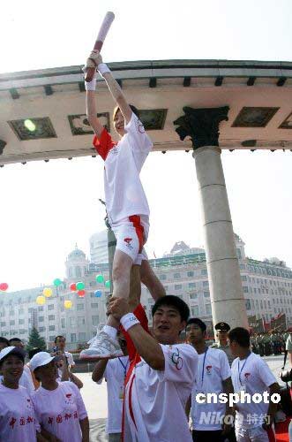 7月11日,“冰上搭檔”、花樣滑冰世界冠軍張丹、張昊在哈爾濱傳遞奧運(yùn)火炬,張昊托起張丹用高難動作傳遞火炬。