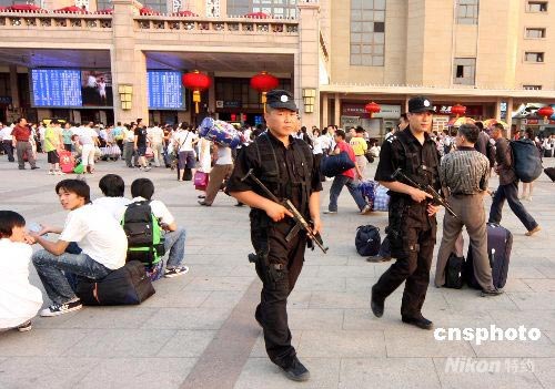 7月22日,特警在北京站廣場巡邏。北京鐵路警方昨日宣布,為確保奧運會安全,鐵路安檢從即日起全面升級,只要進入火車站就要接受各種安檢,其中以前不要求檢查的液體,從現在起也要“過機”。 中新社發(fā) 吳芒子 攝