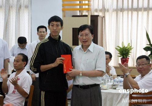 7月23日,臺(tái)灣行政部門負(fù)責(zé)人劉兆玄在高雄左營體育訓(xùn)練中心看望備戰(zhàn)北京奧運(yùn)的臺(tái)灣體育健兒。他期許運(yùn)動(dòng)員們?nèi)σ愿埃〉煤贸煽。圖為劉兆玄在該中心運(yùn)動(dòng)員餐廳,向運(yùn)動(dòng)員們致贈(zèng)加菜金,由上屆奧運(yùn)跆拳道冠軍朱木炎代表接受。 中新社發(fā) 黃少華 攝