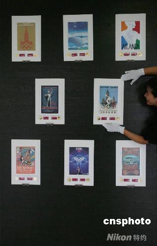 由國際奧組委授權(quán)、國際奧林匹克博物館館藏珍品《百年奧運(yùn)——理解奧運(yùn)會金牌海報典藏》大全套首批7月30日抵京,從即日起開始發(fā)售。該典藏首次集齊歷屆奧運(yùn)會金牌,首次以絲綢印刷歷屆海報。圖為工作人員接收首批產(chǎn)品,并懸掛布置展出現(xiàn)場。 中新社發(fā) 李英 攝