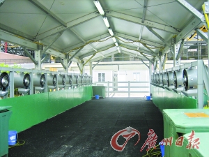 在房間內(nèi),馬匹可以“嘆空調(diào)”,在室外怎么辦呢?記者在幾個室外練習場的旁邊看到了兩座降溫站,所謂降溫站,就是用一種特殊的風扇將水吹成霧狀,霧狀的水噴到馬兒的身上,能夠起到降溫的作用。一位工作人員向記者介紹,如果馬匹需要迅速將體溫降下來,則可使用水槍,他交給記者試了一下,水量很大卻柔和,既能給馬匹迅速降溫,也不至于噴力太大驚嚇到馬匹。為了應(yīng)付高溫的天氣,降溫站的旁邊儲存了大量的冰塊,降溫使用的水都是冰塊融化后的冰水,降溫效果十分明顯。工作人員還告訴記者,他們24小時都得值班,因為有些騎手喜歡晚上訓練,有些騎手則喜歡早起訓練,都是為了避開高溫天氣。