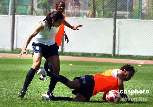 8月3日,巴西女足靈魂隊員瑪塔(左)與隊友在訓(xùn)練中。當(dāng)日,巴西女足隊員在沈陽奧體中心訓(xùn)練場進(jìn)行訓(xùn)練。6日,巴西女足將在奧運會女足比賽小組賽中對陣德國女足。中新社發(fā) 張宇 攝