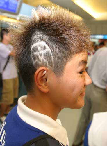 參加北京奧運的中華臺北代表隊女壘隊七日啟程,擔(dān)任女壘隊第一棒和守左外野的賴孟婷在發(fā)型上作了特殊造型,剃出北京奧運的符號。(“中央社”圖)