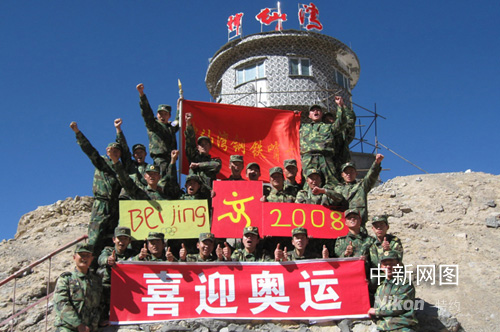 中新網(wǎng)烏魯木齊8月8日電 (董永彪) 2008北京奧運即將召開,位于新疆喀喇昆侖山脈的神仙灣哨所官兵親手自制了奧運標志,把對奧運的美好祝愿化作戍邊守防的具體行動,表達對北京奧運的祝福。