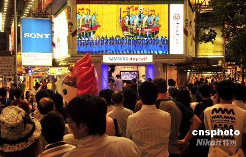 八月八日晚上,香港大批市民在銅鑼灣鬧市街頭上,觀看大屏幕電視直播的奧運開幕盛況。中新社發(fā) 譚達明 攝