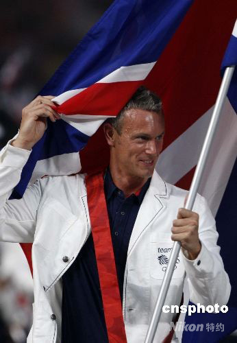 英國游泳運(yùn)動(dòng)員馬克·福斯特為英國代表團(tuán)高舉大旗。中新社發(fā) 杜洋 攝