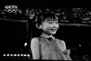 “五星紅旗迎風(fēng)飄揚(yáng),勝利歌聲多么響亮……”清澈的童音響徹“鳥(niǎo)巢”上空,昨晚8時(shí)6分,北京奧運(yùn)會(huì)開(kāi)幕式升旗儀式前,一名身著紅色紗裙的女孩出現(xiàn)在電視畫(huà)面中,她緊攥拳頭,領(lǐng)唱《歌唱祖國(guó)》,隨后,代表56個(gè)民族的少年起舞、五星紅旗升起。